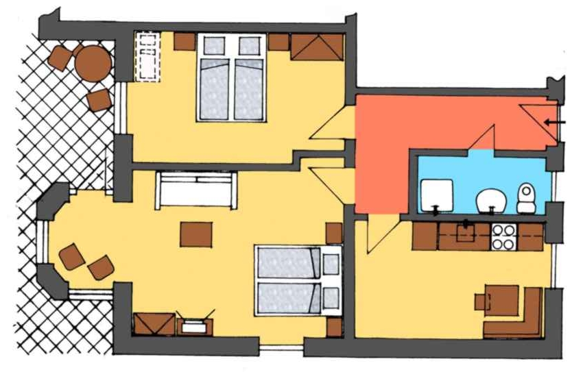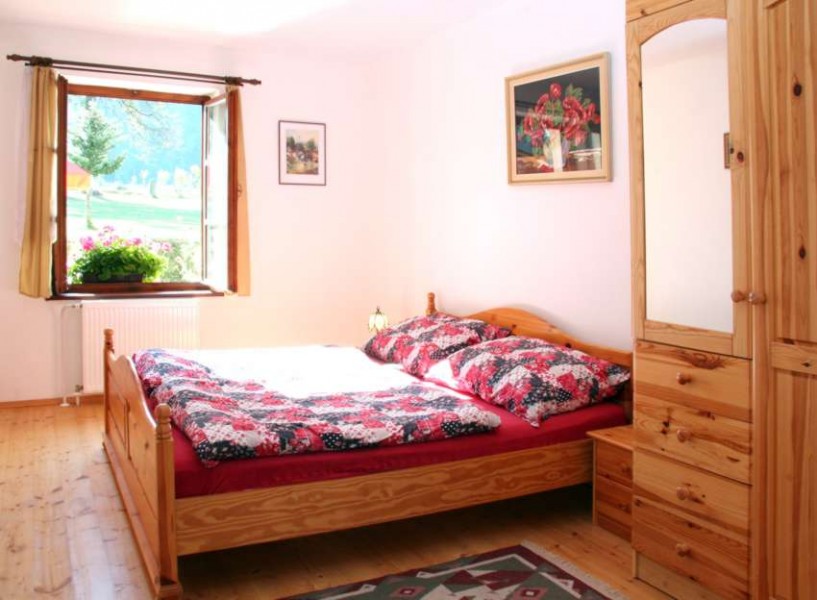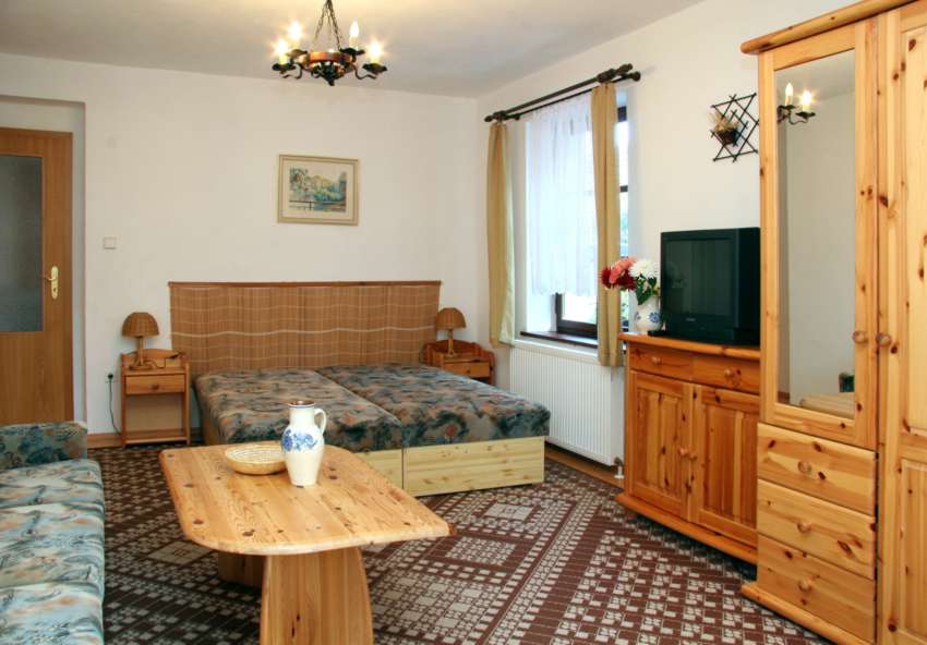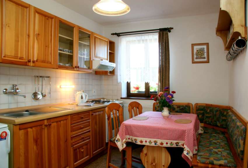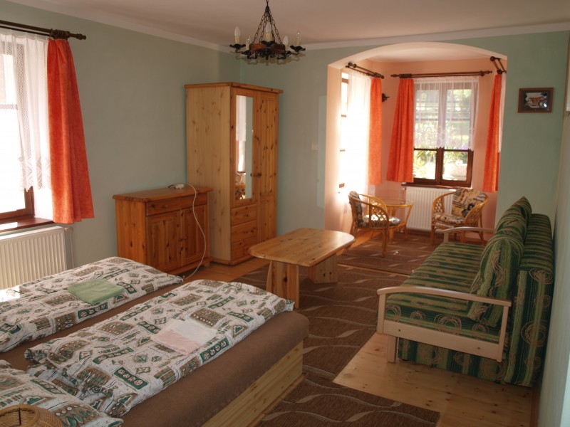 Dvoupokojový byt se vstupem na uzavřenou terasu, samostatnou kuchyní s jídelnou (vybavenou el.troubou se sklokeramickou deskou, ledničkou, myčkou a mikrovlnou troubou) a s vlastním sociálním zařízením (WC a sprcha). V ložnici je dětská postýlka. Ubytování je vhodné pro 4-5 osob. Tento byt je zařízen nábytkem z přírodních materiálů. Podlahy jsou dřevěné, proto doporučujeme domácí obuv.