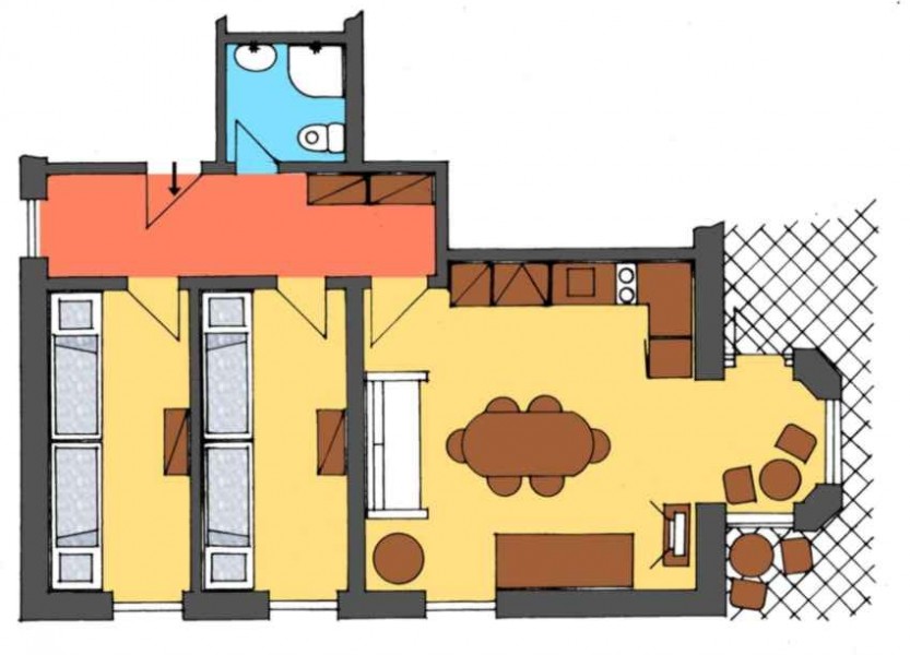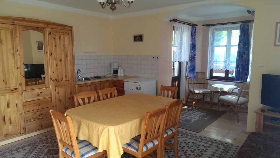 Třípokojový byt se vstupem na uzavřenou terasu a vlastním sociálním zařízením (WC a sprcha), vč. minikuchyně. Ubytování je vhodné pro 4-6 osoby. Tento byt je zařízen nábytkem z přírodních materiálů. Podlahy jsou dřevěné, proto doporučujeme domácí obuv.