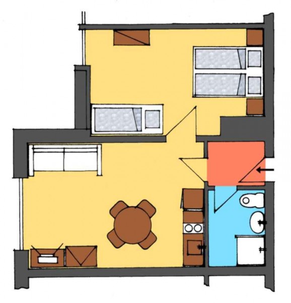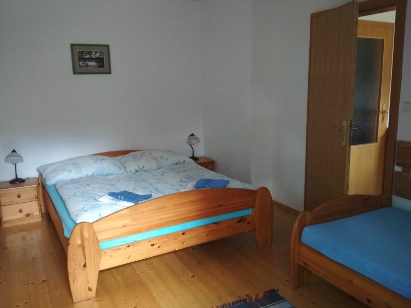 Dvoupokojový byt bez terasy, bez balkónu a s vlastním sociálním zařízením (WC a sprcha), vč. minikuchyně. Ubytování je vhodné pro 2-4 osoby. Tento byt je zařízen nábytkem z přírodních materiálů. Podlahy jsou dřevěné, proto doporučujeme domácí obuv.