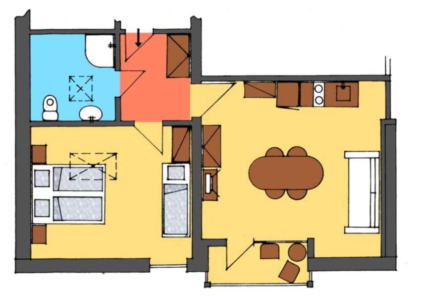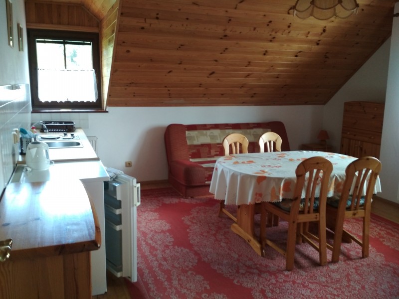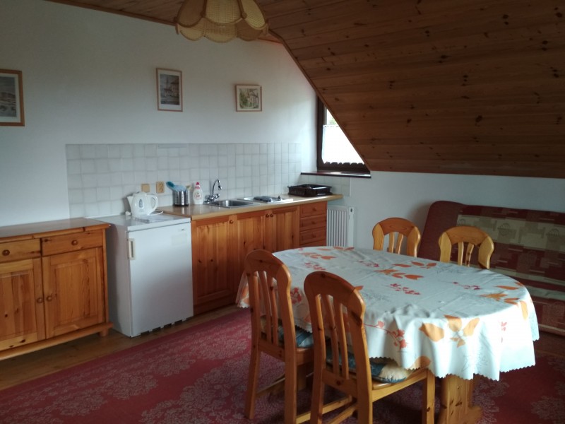 Dvoupokojový byt s balkónem a s vlastním sociálním zařízením (WC a sprcha), vč. minikuchyně. Ubytování je vhodné pro 3-4 osoby. Tento byt je zařízen nábytkem z přírodních materiálů. Podlahy jsou dřevěné, proto doporučujeme domácí obuv.